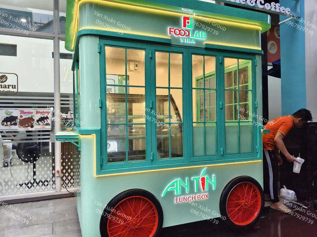 - Trang trí: chữ nổi, hộp đèn theo yêu cầu, đèn LED chạy viền kiot, bánh xe máy trang trí sơn màu theo yêu cầu